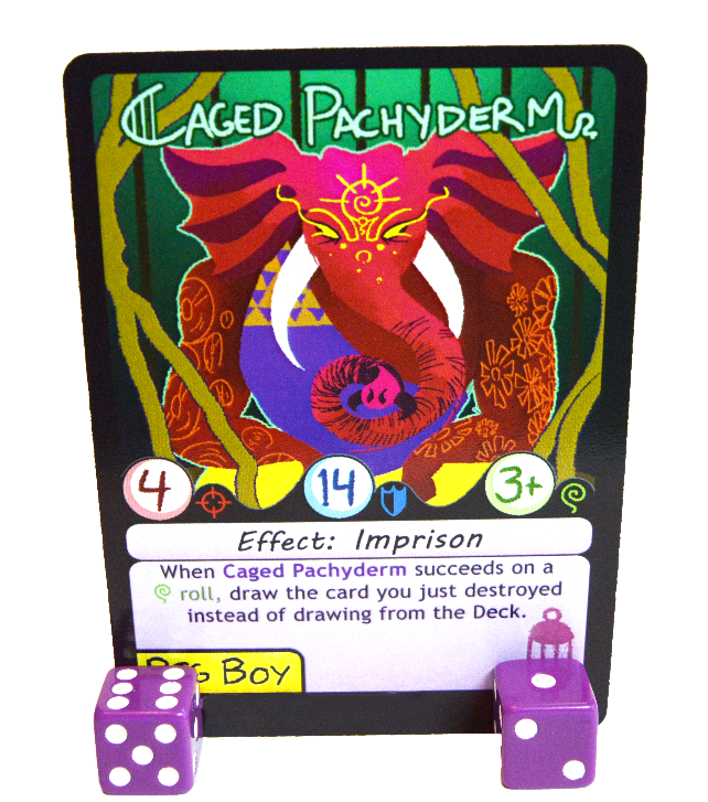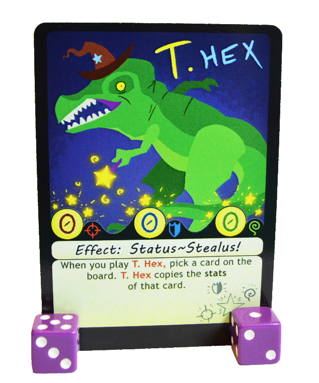 Gameplay runs in a slick & quick combination of strategy & chance, with players using the cards in their possession to attack their opponents' cards.If a player destroys an opponent's card, they roll to draw a random card from the Deck. This is the only reliable way to keep getting cards.All cards have their own unique stats and a variety of Effects, which twist the rules in all sorts of ways and can be used to bamboozle your foes.