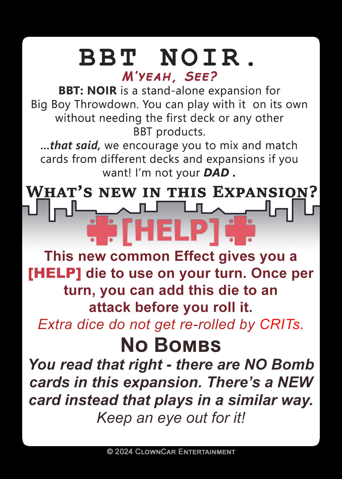 This 50-card Expansion can be played all on its own, but it can also add all sorts of variety to the base game! With a new type of Bomb card, new Events, and over 40 new characters, we encourage you to mix and match past and future BBT decks to your heart's content!